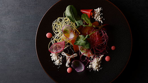 色彩感豊かな紅芯大根とラディッシュの華やかなサラダ、梅干しのピューレを包んだかぶや木苺の