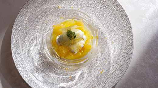 仕上げに甘夏の果汁とほのかな苦みのゼストで仕立てたシートを飾った、五感でお楽しみいただける一品です。