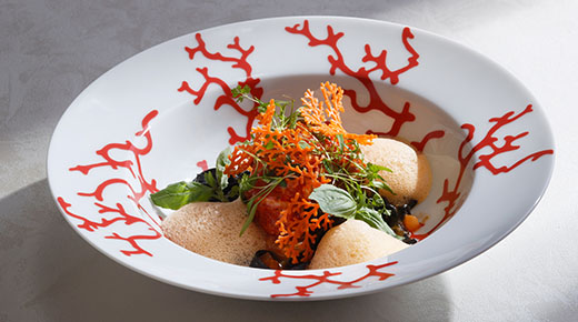 中国料理の「漿」という技法によってオマール海老の弾力のある食感と旨味をしっかりと閉じ込めました。