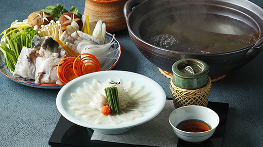 河豚の薄造りや唐揚げ、ふぐちりなど旬の味覚を味わう全7品