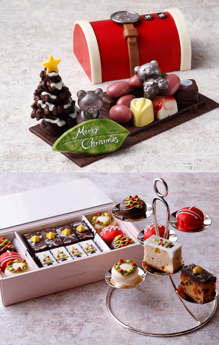 サンタクロースの服をイメージした手づくりのチョコレート製のボックスの中に、さまざまなフレーバーのボンボンショコラと、ルビーショコラを使ったアマンドショコラを詰め合わせました。ボンボンショコラは定番の「キャラメルブールサレ」「ガナッシュ ノワール」「プラリネ」のほか、華やかなハート形の「苺ライム」、甘酸っぱい味覚の「カシス」、徳島県産木頭ゆずのジュレが入った「柚子」をそろえています。くまの形のチョコレートはカカオ64%のビターな味わいで、そのままお召し上がりになるだけではなく牛乳に溶かすことでホットチョコレートとしても楽しめます。クリスマスツリーはアーモンドプラリネによる細工で、華やかなクリスマスの気分を演出します。